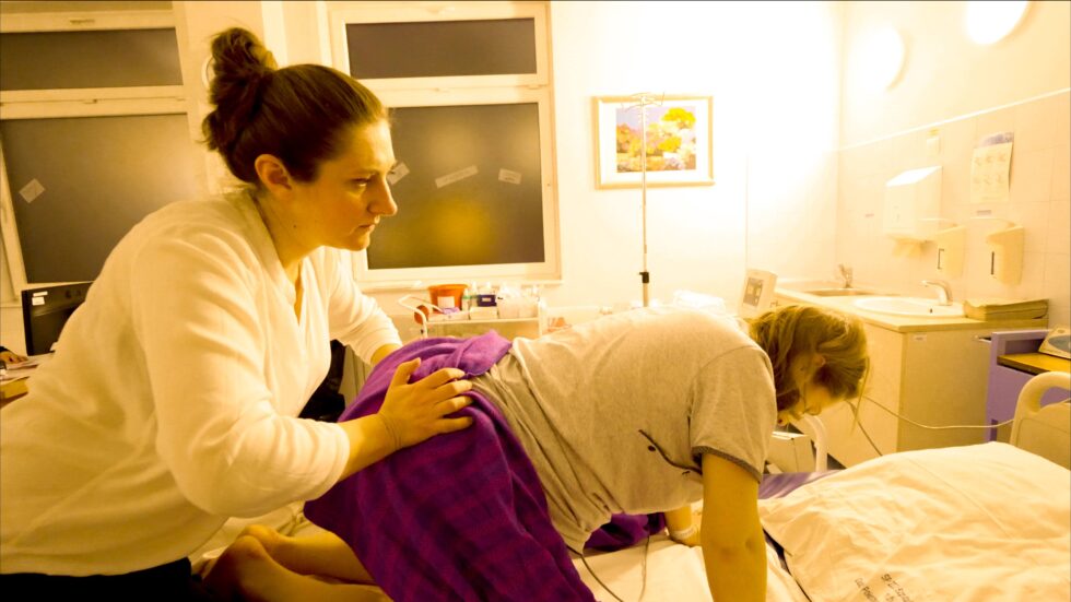 – nad ranem Ania jest już bardzo zmęczona, ale jej spokojny umysł umożliwa odpoczynek między skurczami. Jej cała drużyna porodowa (partner i doula) również odczuwają trud całonocnego wspierania. O 7 rano, pada propozycja podania syntetycznej oksytocyny.